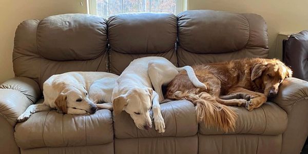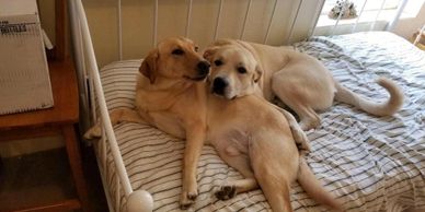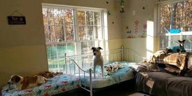 Our sunny and cheerful Hound Lounge is especially loved by our guests! It's furnished with comfortable daybeds, chairs, and couches perfect for pups to hang out and snuggle while basking in the sun! It also offers our more curious guests a perfect view of the play yard!